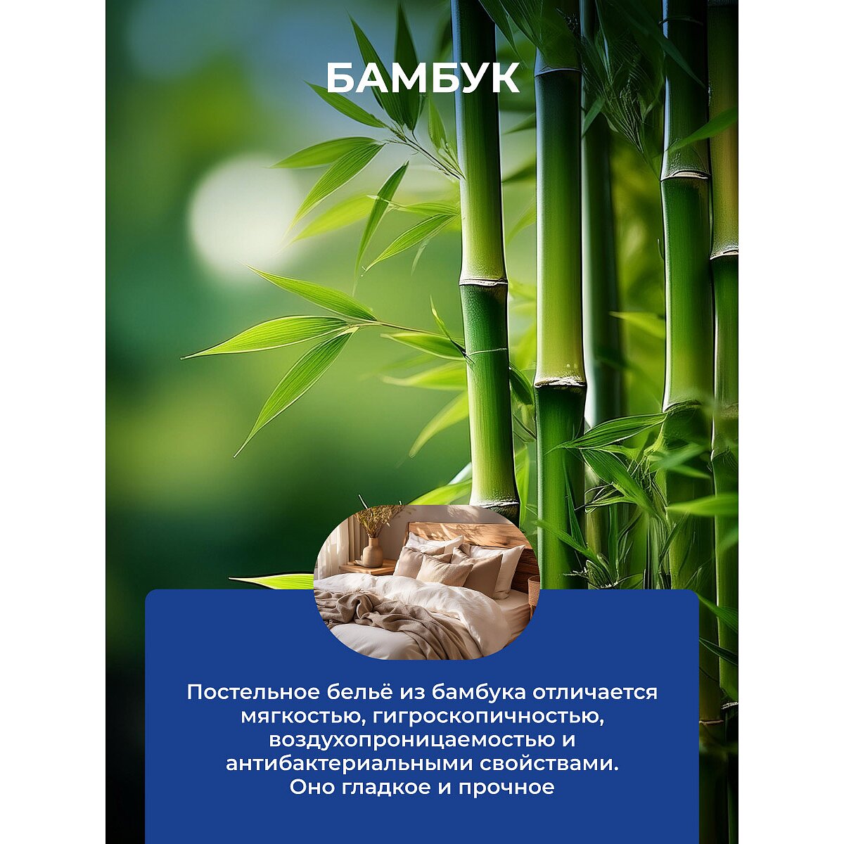 Постельное белье из бамбука гигроскопично, воздухопроницаемо и обладает природными антибактериальными свойствами. Оно невероятно гладкое, но при этом не «скользит», как шелк, и обладает высокой прочностью.