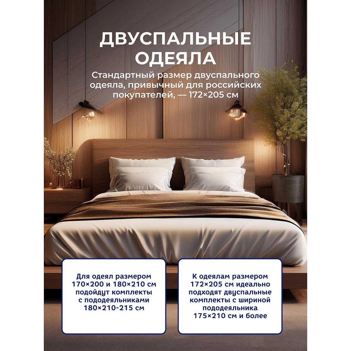 Размеры одеял для двуспальных кроватей существенно больше по ширине. Так наиболее привычный для российских покупателей размер двуспального одеяла 172х205 см предлагают производители одеял Горизонт, Олтекс, Asabella, Dargez, Kingsilk, Onsilk. К этим одеялам идеально соответствуют российские стандарты двуспальных комплектов с шириной пододеяльника 175х210 см и более.