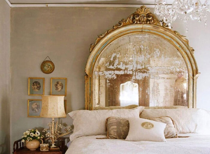 Если в планах избавиться от старого шкафа, комода, не торопитесь поступать аналогично с зеркалами. Их можно использовать после некоторой реставрации в качестве оригинального изголовья к двуспальной кровати.