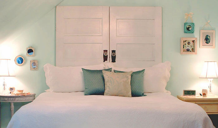 Если стиль спальни требует присутствия старых вещей – тогда дверь, вышедшую из моды, можно смело реставрировать и монтировать в качестве изголовья. Стильно, интересно и совершенно бесплатно!