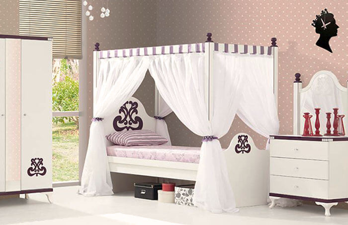 Легкий балдахин подарит малышу ощущение защищенности и безопасности, где можно засыпать без страха перед ночными гостями. Кроме того, простой отрез материи, закрепленный над кроваткой, убережет ребенка от нашествия комаров и мошек летом. Выросшему мальчику вряд ли придется по вкусу идея с балдахином, а вот многие юные принцессы согласны спать по-королевски вплоть до старших классов.